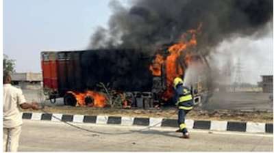 नेशनल हाईवे पर चल रहे ट्रक में भीषण आग, बाल-बाल बचे चालक और सहायक