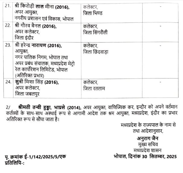 एमपी में 2025 बैच के IAS अधिकारियों की पोस्टिंग, प्रशासन को मिले नए चेहरे