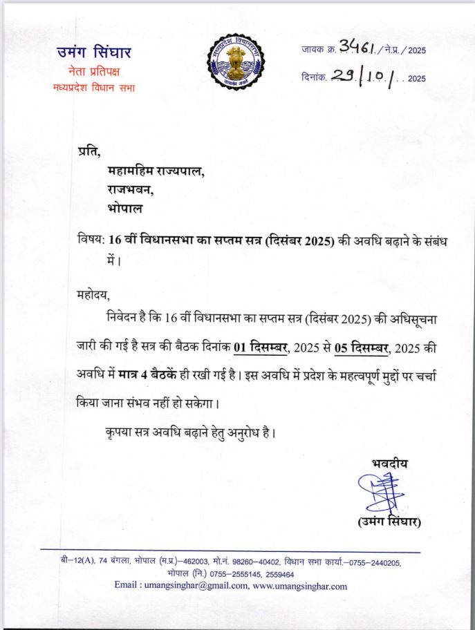 उमंग सिंघार ने अपने पत्र में उल्लेख किया है कि प्रदेश के सामने कई महत्वपूर्ण विषय हैं, लेकिन सीमित अवधि में इन विषयों पर व्यापक बहस संभव नहीं होगी। उन्होंने पत्र में आग्रह किया है कि लोकतांत्रिक परंपरा को ध्यान में रखते हुए सत्र की अवधि बढ़ाई जाए ताकि विपक्ष और सत्ता पक्ष दोनों को जनता के हित से संबंधित प्रश्नों पर विस्तार से चर्चा का अवसर मिल सके।नेता प्रतिपक्ष ने इसको लेकर कहा कि विधानसभा लोकतंत्र का सर्वोच्च मंच है, और जनता की आवाज को वहां पूरी गंभीरता से सुना जाना चाहिए। सत्र का विस्तार इसी भावना को सशक्त करेगा।