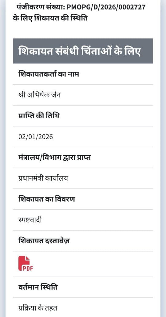 नई दिल्ली। मध्यप्रदेश की राजधानी भोपाल से जुड़े बहुचर्चित शारिक मछली मामले में अब प्रधानमंत्री कार्यालय (पीएमओ) ने संज्ञान ले लिया है। शिकायतकर्ता अभिषेक जैन द्वारा की गई शिकायत को पीएमओ ने गृह मंत्रालय से जुड़े संयुक्त सचिव स्तर के वरिष्ठ अधिकारी को सौंप दिया है। इस घटनाक्रम के बाद मामले की गंभीरता और बढ़ गई है तथा केंद्रीय स्तर पर निष्पक्ष जांच की उम्मीद जगी है। प्राप्त जानकारी के अनुसार, पीएमओ ने यह शिकायत गृह मामलों से संबंधित संयुक्त सचिव डॉ. आर.के. मित्रा को अग्रेषित की है। माना जा रहा है कि प्राथमिक जांच और तथ्यों के परीक्षण के बाद गृह मंत्रालय द्वारा आगे की आवश्यक कार्रवाई की जाएगी।