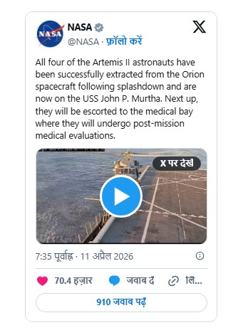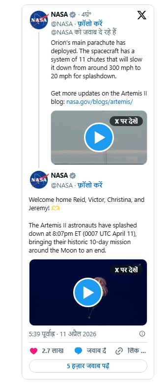 नासा द्वारा दी गई जानकारी के मुताबिक स्पेसक्राफ्ट वापसी के समय जब वायुमंडल में प्रवेश कर रहा था। तब 32 गुना ध्वनि की गति से आगे बढ़ा और हजारों डिग्री तापमान झेलते हुए पैराशूट की मदद से लगभग 17 मील प्रति घंटे की रफ्तार से पानी में उतरा। इस मिशन को नासा के आर्टेमिस प्रोग्राम का महत्वपूर्ण हिस्सा बताया जा रहा है। इसके जरिए चंद्रमा पर मानव बेस स्थापित करना और मंगल ग्रह पर मानव मिशन भेजना है। आर्टेमिस ll के जरिए चंद्रमा की परिक्रमा सफलतापूर्वक कर ली गई है अब आर्टेमिस lll के जरिए चंद्रमा की सतह कर उतरने की योजना है।
