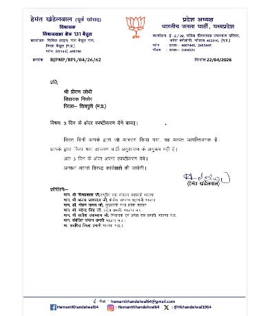 भोपाल/शिवपुरी, 22 अप्रैल 2026। मध्यप्रदेश की सियासत में अनुशासन को लेकर भारतीय जनता पार्टी ने सख्त रुख अपनाते हुए पिछोर विधायक प्रीतम लोधी को कारण बताओ नोटिस जारी किया है। पार्टी ने उनके हालिया आचरण को “अत्यंत आपत्तिजनक” और संगठन के अनुशासन के विपरीत बताते हुए 3 दिन के भीतर जवाब मांगा है। यह नोटिस हेमंत खंडेलवाल द्वारा जारी किया गया है, जो भाजपा प्रदेश संगठन में महत्वपूर्ण भूमिका निभा रहे हैं। जारी पत्र में स्पष्ट कहा गया है कि यदि निर्धारित समय में संतोषजनक स्पष्टीकरण प्रस्तुत नहीं किया गया, तो विधायक के खिलाफ संगठनात्मक कार्रवाई की जाएगी। पत्र में यह भी उल्लेख किया गया है कि संबंधित आचरण पार्टी की मर्यादा और अनुशासन के अनुरूप नहीं है, जिससे संगठन की छवि प्रभावित हो सकती है।