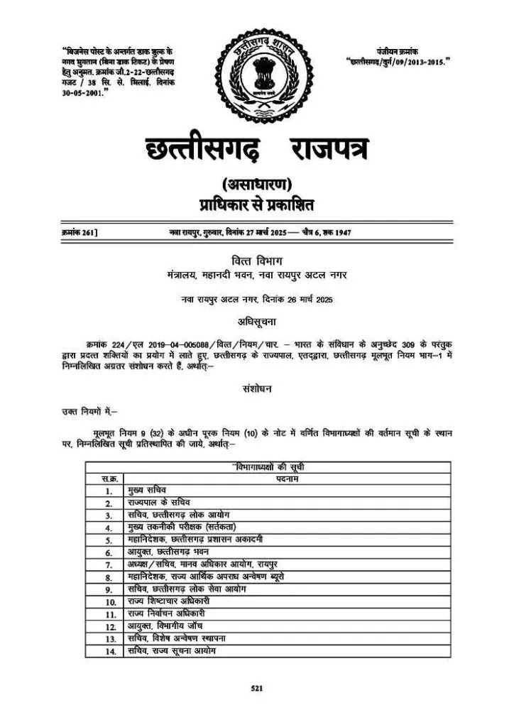 रायपुर: छत्तीसगढ़ सरकार ने सभी सरकारी विभागों के प्रमुखों को लेकर बड़ा फेरबदल किया है। इसको लेकर राज्य सरकार की ओर से अधिसूचना भी जारी कर दी गई है। राज्य आर्थिक अपराध अन्वेषण ब्यूरो (CG EOW Chief DG) के प्रमुख को लेकर बड़ा बदलाव किया गया है। अब इस विभाग का अधिकारी महानिदेशक स्तर का अधिकारी होगा। आपको बता दें कि वर्तमान में ब्यूरो के प्रमुख के तौर पर आईजी स्तर के अधिकारी नियुक्त किए जाते हैं।