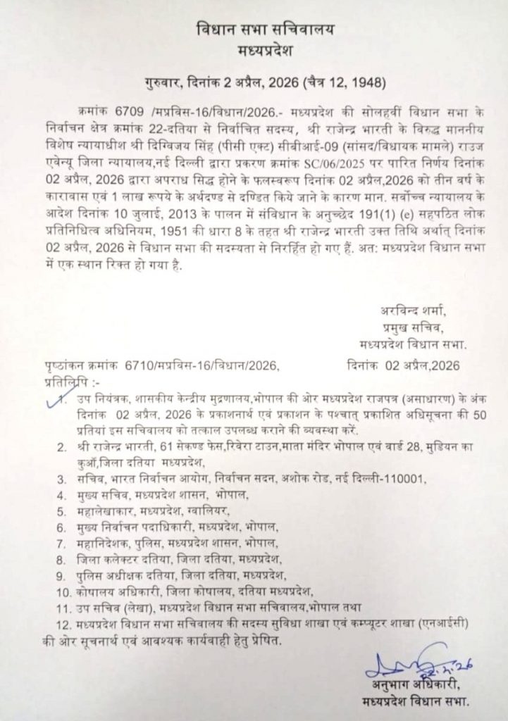 दरअसल, राजेंद्र भारती को 27 साल पुराने एफडी हेराफेरी मामले में दिल्ली की एमपी-एमएलए कोर्ट ने 3 साल की सजा सुनाई थी. वहीं कोर्ट उन्हें जमानत भी दे दी थी और 60 दिनों में अपील दायर करने को कहा था. कोर्ट के फैसले के बाद कल देर रात भोपाल विधानसभा प्रमुख सचिव अरविंद शर्मा सचिवालय पहुंचे और राजेंद्र भारती की सदस्यता खत्म करने का आदेश जारी कर दिया।